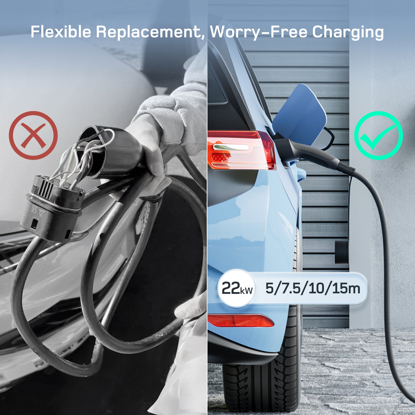 - FLEXIBLE CHOICE - The dé replacement cable has a type 2 open design and offers four options for 11kW charging cable: 5m, 7.5m, 10m and 15m. These lengths meet the needs of different scenarios, from home to public charging stations. You can choose according to the situation to avoid a cable that is too long or too short. This ensures greater convenience when charging.