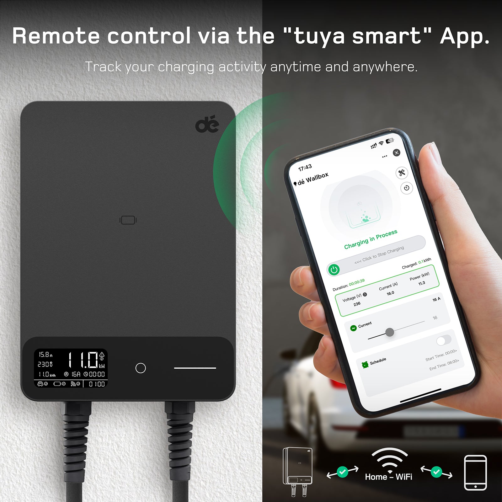 - Intelligent Charging The tuya smart app can be downloaded on Android and iOS and supports timed charging, power adjustment, remote start and shutdown, and check charging records. The dé Wallbox gives you the flexibility to design your charging processes according to your wishes and needs