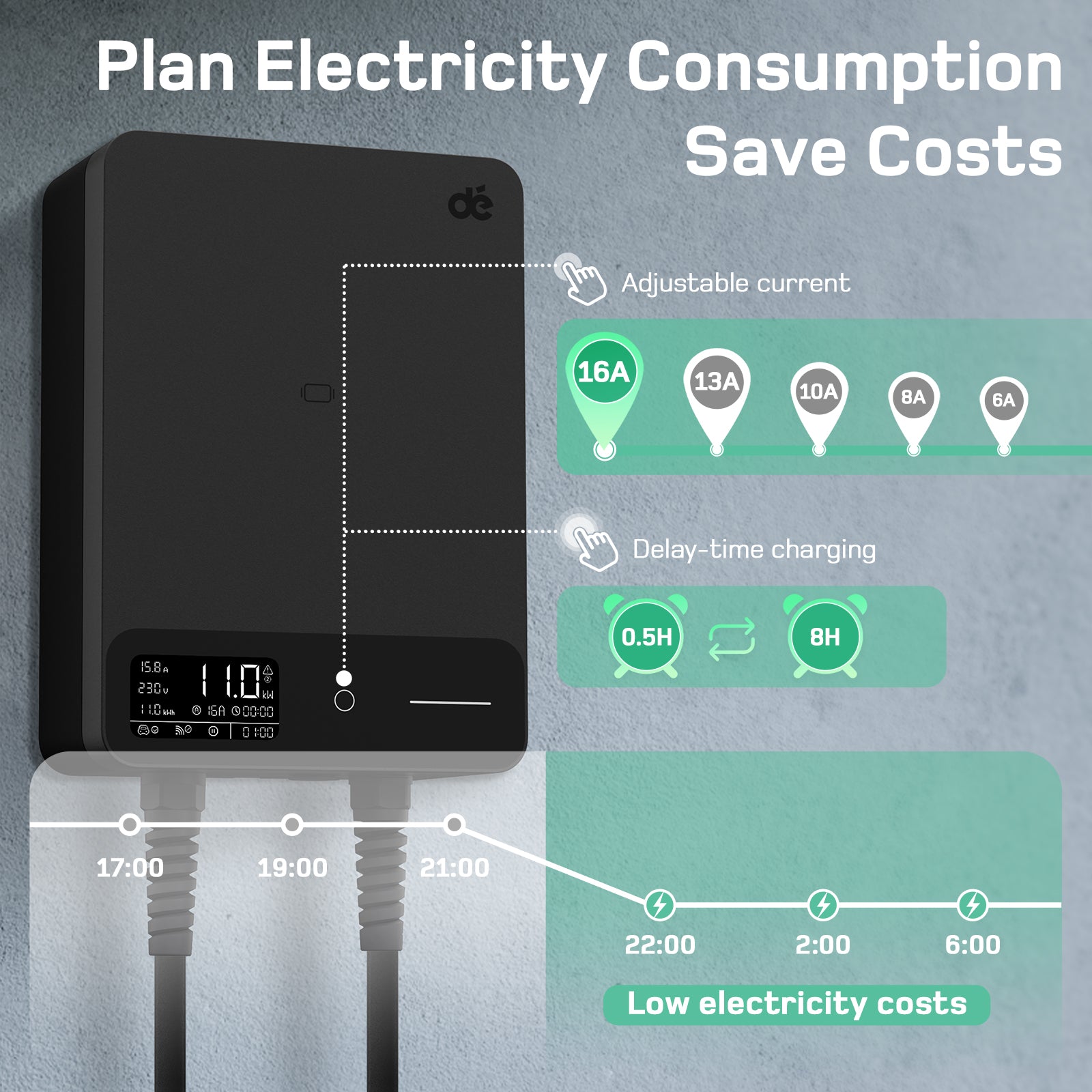 - Adjustable charging current: adjust the charging current at the touch of a button and choose between 6A, 8A, 10A, 13A, 16A. The wallbox adapts flexibly to different charging current requirements and is therefore ideal for photovoltaic systems. You can also set a charging delay of 0.5 to 8 hours to control the charging process according to your needs. All settings are made directly on the charger