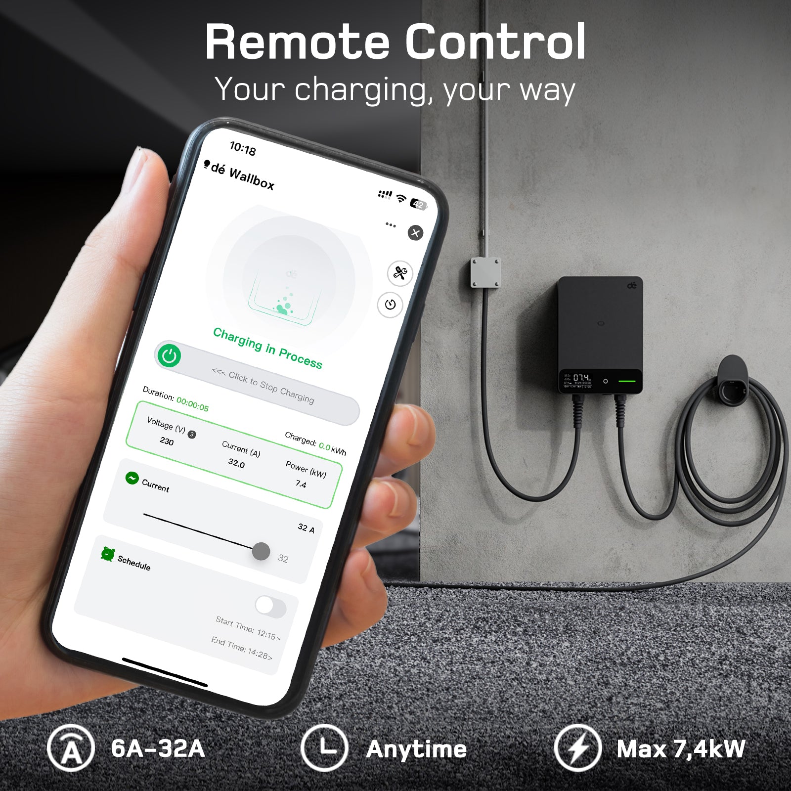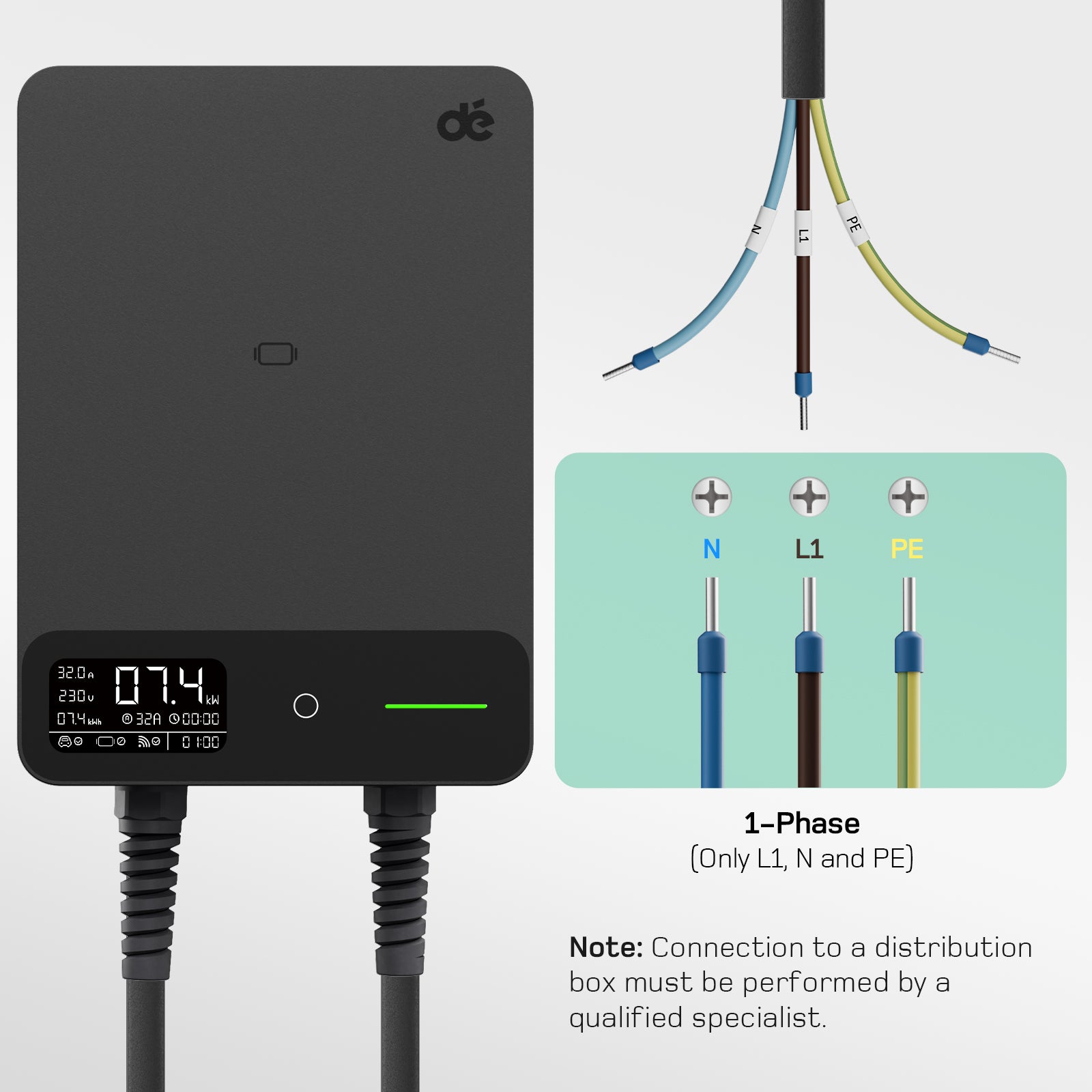 - dé Wallbox 7.4 kW with electricity meter [1-phase 400V 6-32A], home charging station CEE 32A to type 2 EV charger with cable holder compatible with BEV and PHEV black