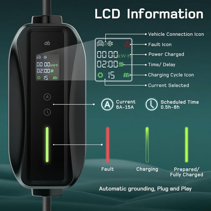 • 【Multi-Function】Charge your Electric Vehicle with Depow best EV home Charger with multi functions. Its adjustable current enables you choose from 6A/8A/10A/13/15A and Compatible with rooftop solar system as well. The 0-8 hrs time-delay function allows you to schedule a EV charging plan at the lowest cost. LCD on EV car charger display monitors the charging status constantly.