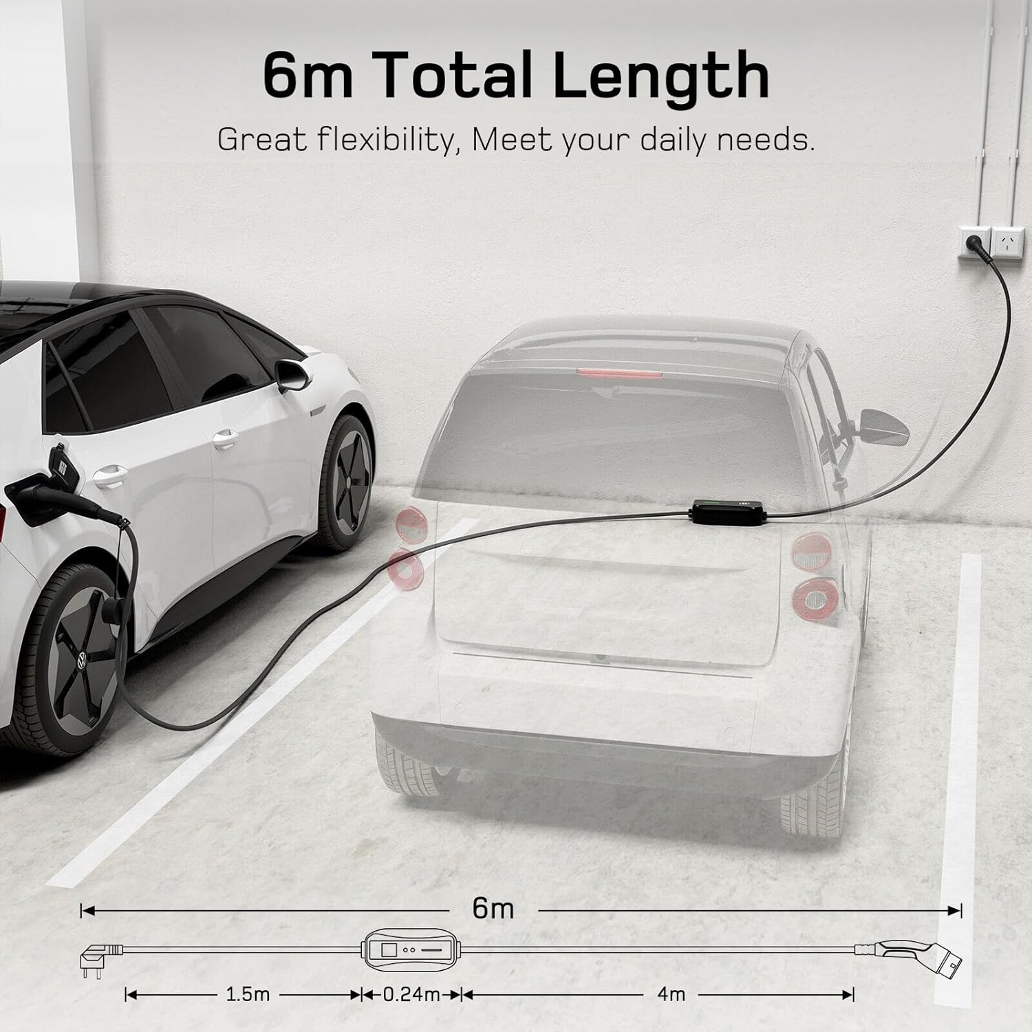 • 【No Installation Required】Charge your Electric Car wherever with access to AU 15A socket (set current below 15A), or use a EV car Charger 10A to 15A adapter when AU 10A socket at your choice (Please set current below 10A on the charger). 6m to 10m total length makes it easier to reach your parking place.