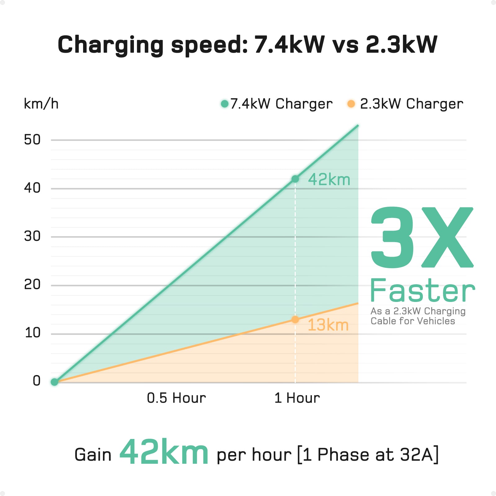 - 【3x faster than household plugs】EV Charging Cable With 5Pin 1-Phase 32A Industrial Plug you get 7.4kW charging power per hour (230Vx32Ax1). 3x faster than normal household australia plugs, 230V x 10A. Save 13 hours by switching from 10A AU Plug to 5PIN Red 32A charger.