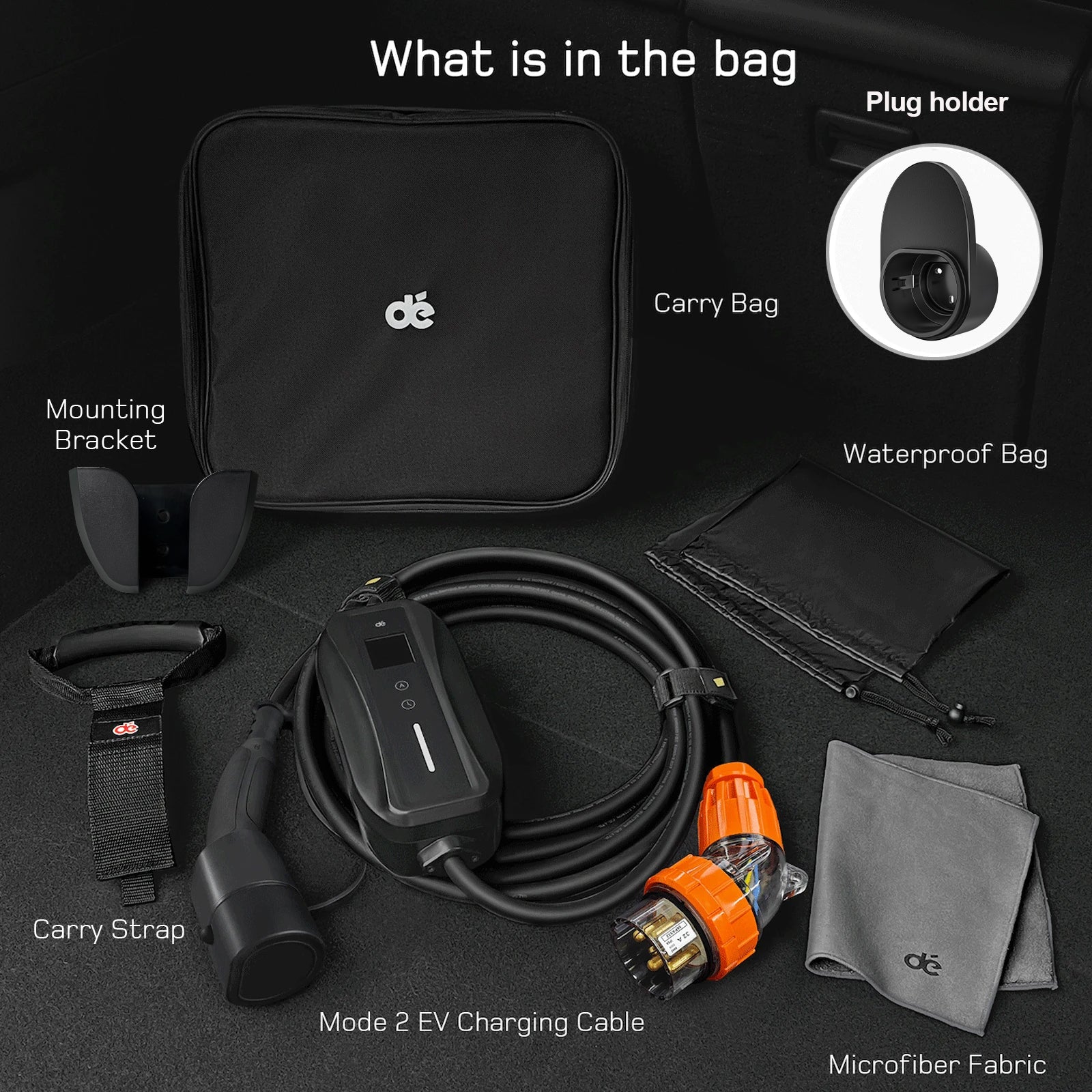 - 【Paket Include】7.4 kW 7M EV Charging Cable, plug holder, waterproof bag, carrying strap, microfibre cloth included. A splash-proof bag for storing your cable in the boot/boot. Compact and foldable design that does not take up too much space, additional support ensures that it is not thrown around in the truck. A carrying strap for cable management, carrying around or hanging on the wall. A cleaning bag in the case and a waterproof bag for use in the rain.